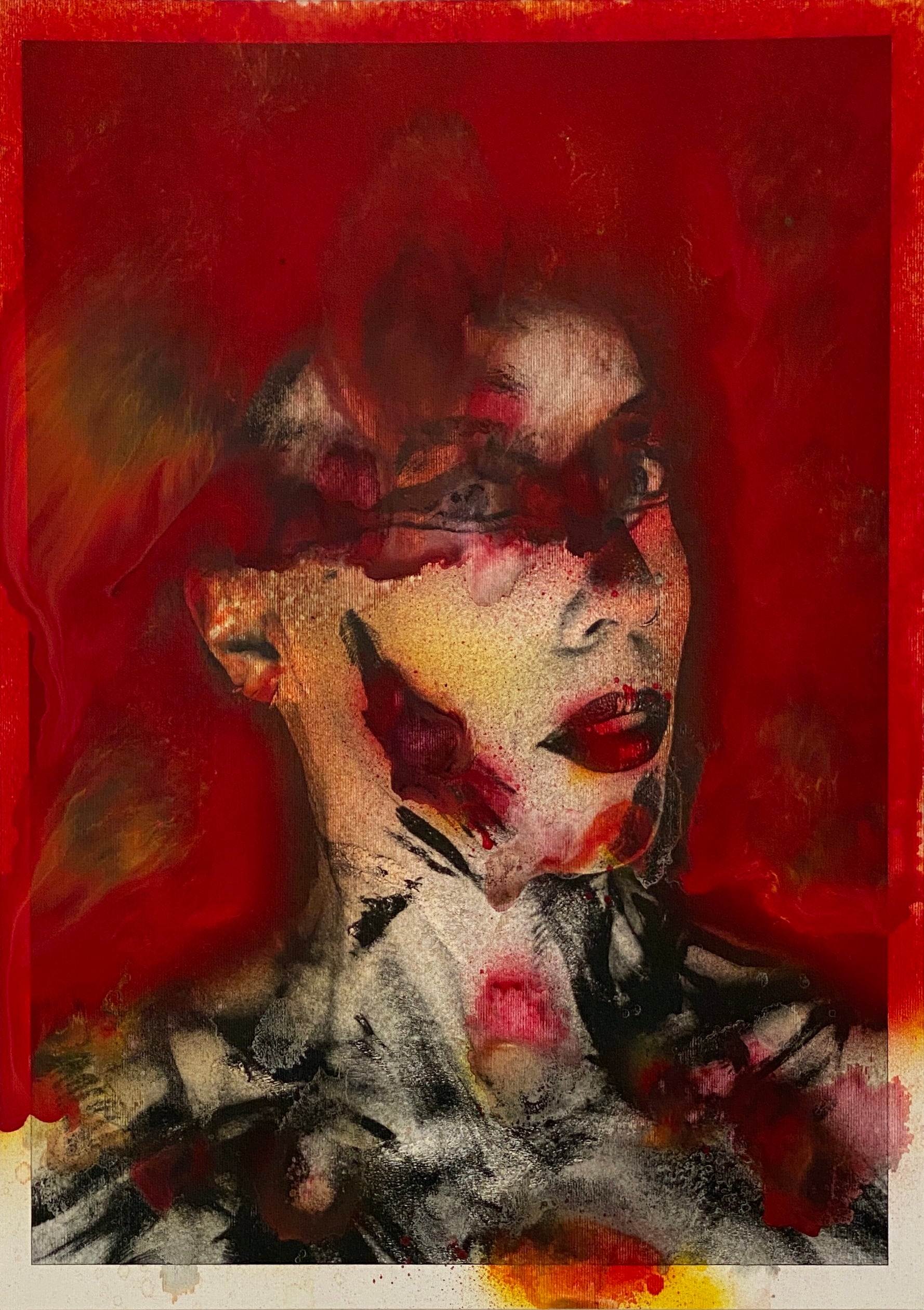 Photographic print retouched by hand with enamels and synthetic thinners on Fedrigoni stucco watercolor paper 300 gr