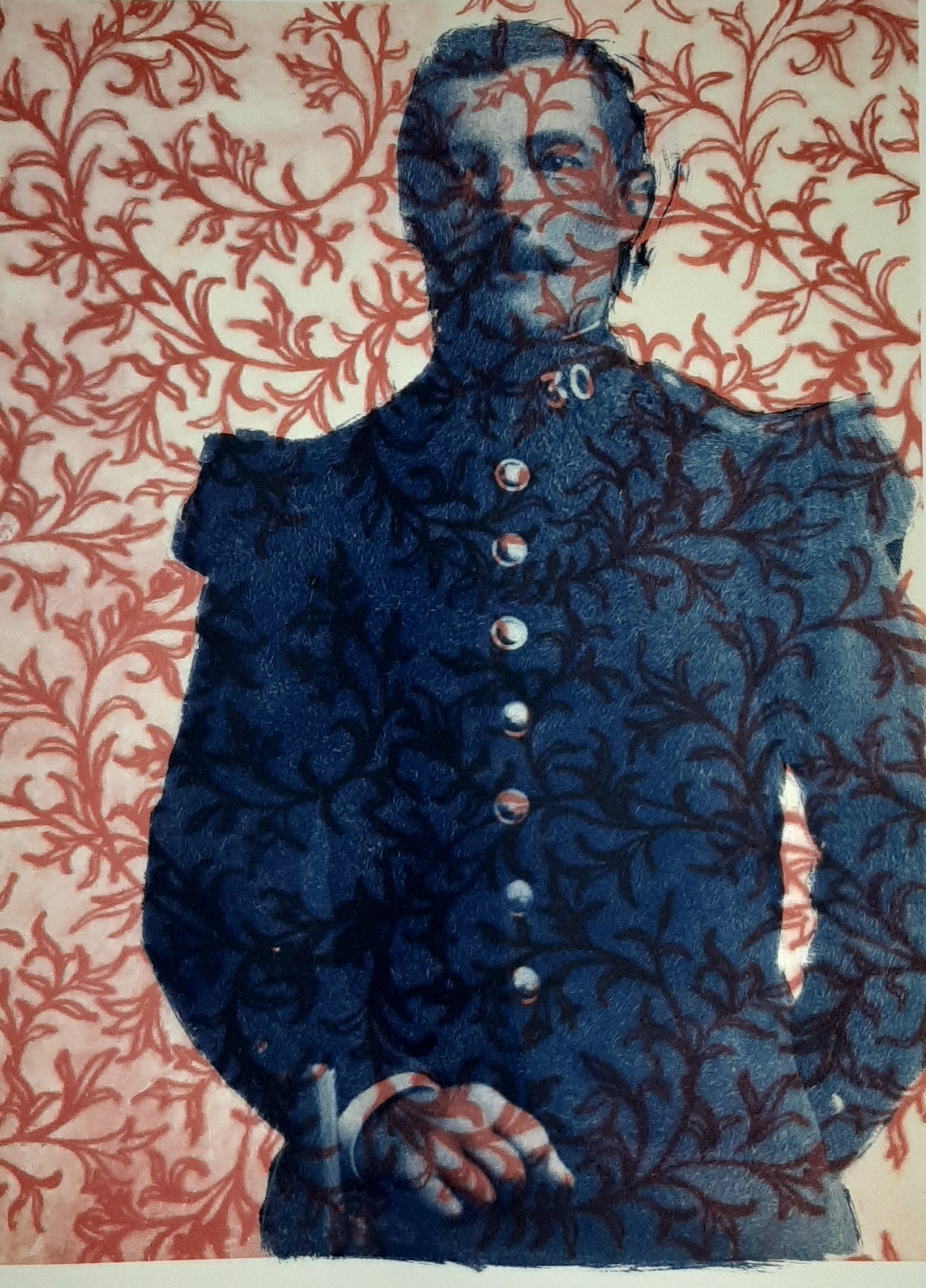 Cyanotype on reproduction of drypoint engraving on Hahnemühle paper 130 gm