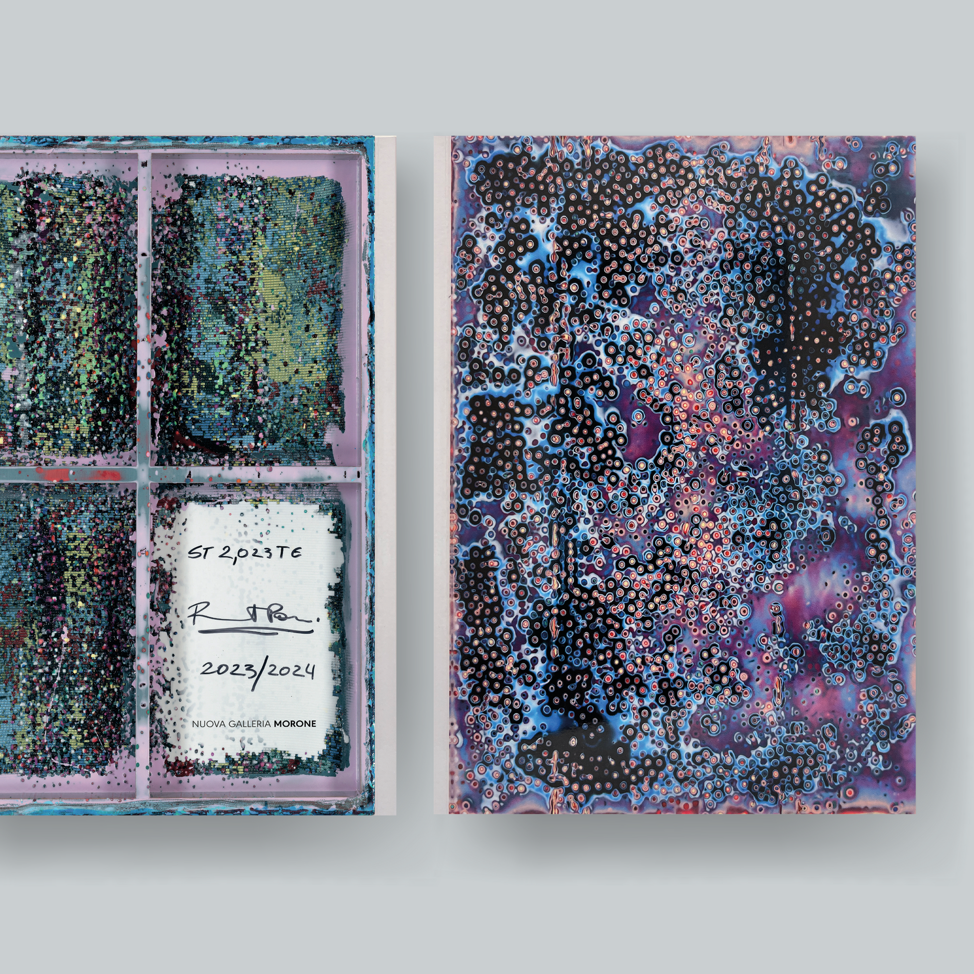 A slow and continuous work of addition and subtraction, which harmonizes it with the sequences and rhythms of Eastern philosophies: a sort of mantra, repeated over months, years, allowing the color and resin to take shape, solidify, and then be sanded, alternating between greater and lesser degrees of smoothness, so that in certain very specific points, the material and symbolic elements emerge "from the abyss" and rise to the surface. Thus appears a universe of colors, shapes, microorganisms, microcosms of infinite hues, allowing us to travel with our eyes, but also with our imagination, leading us to other worlds, perhaps sidereal, light-years away, or closer, present within each of us, deep within our dream visions or our eyes, and which Robert Pan manages to bring to the surface.