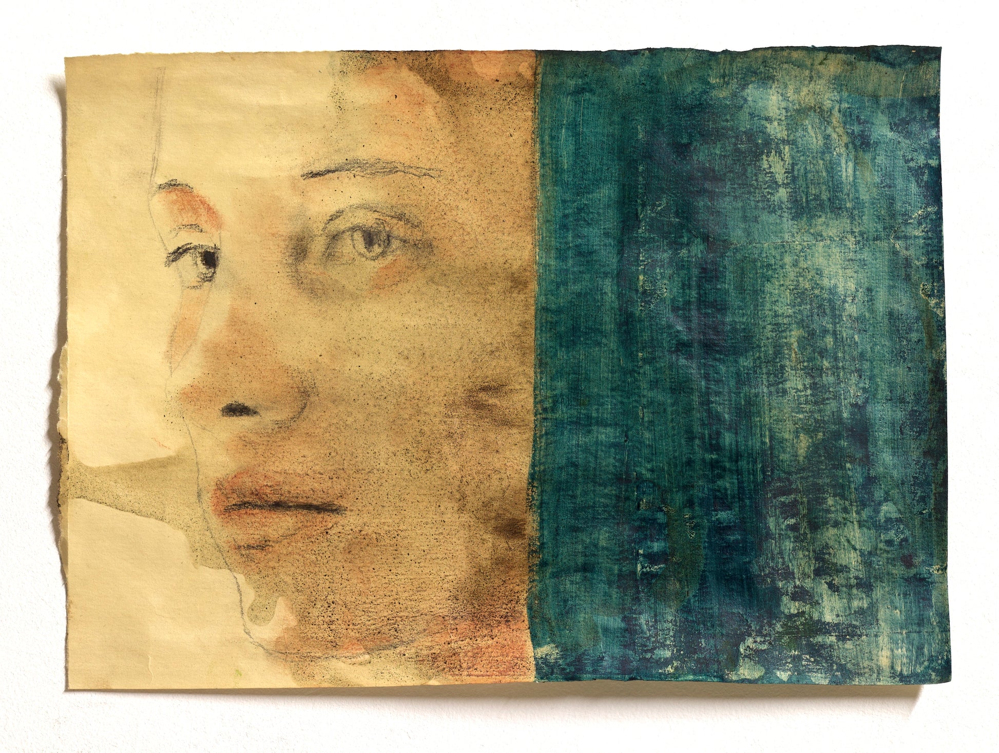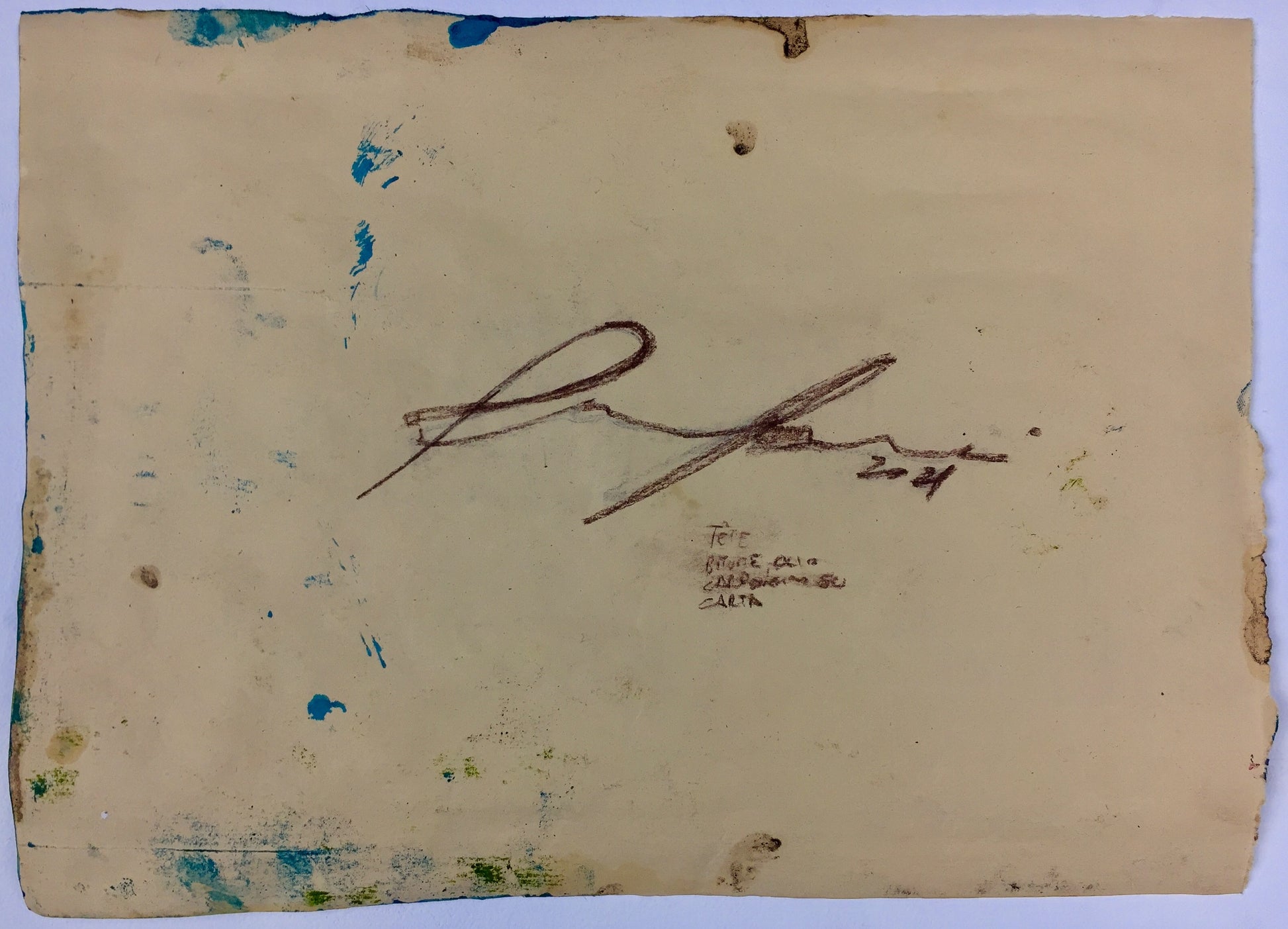 Bitume, olio, sanguigna e carboncino su carta da spolvero