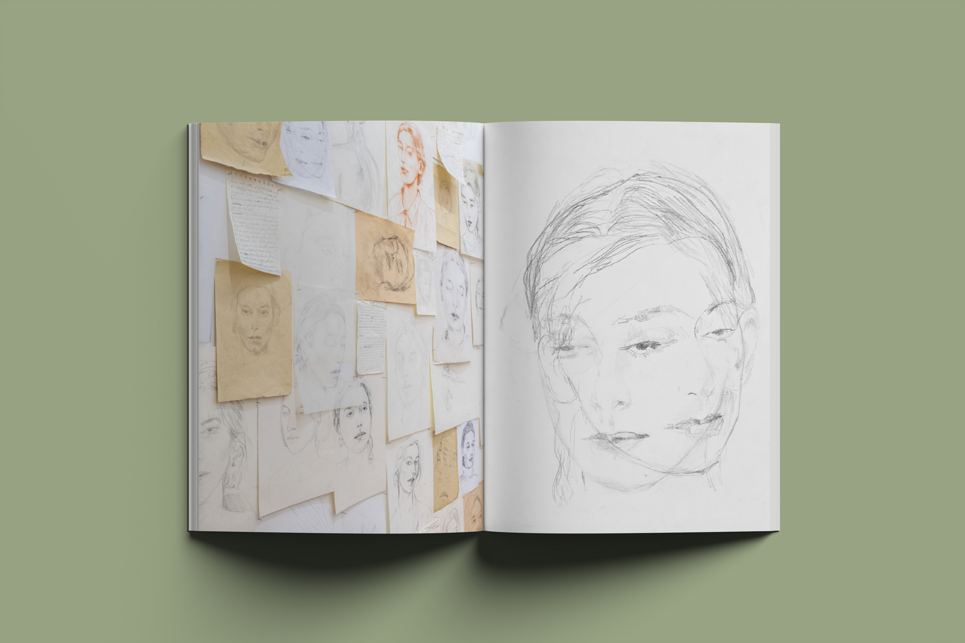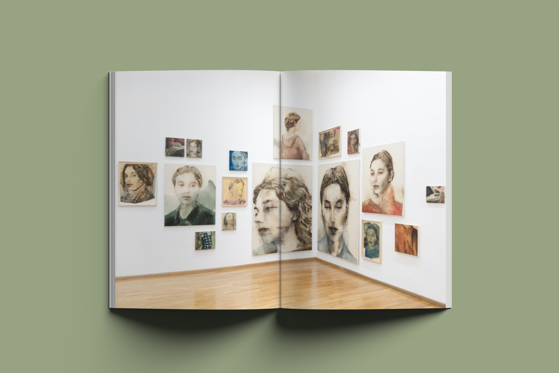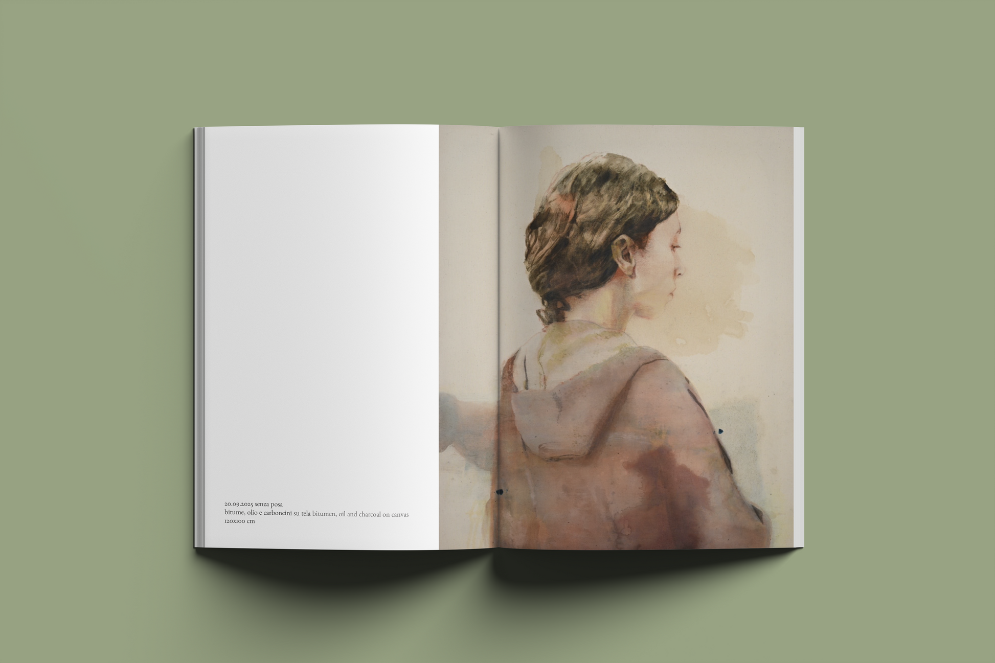 Il volume raccoglie i disegni e i dipinti presentati in mostra, insieme alle immagini ambientali dell’allestimento, restituendo la densità di un progetto che intreccia pratica pittorica e presenza. La sequenza delle opere segue il ritmo delle sessioni di posa, lasciando emergere la ripetizione del gesto come esercizio di attenzione e progressivo avvicinamento a una somiglianza che è insieme formale e interiore.